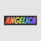 This fun, vibrant, multicolored name tag design features the common first name "ANGELICA", with the letters of the name having a colourful rainbow spectrum like gradient colouring pattern, on a black coloured background. A nametag like this might be worn by a volunteer, a staff member, or a customer service representative whose name is Angelica, to help identify the wearer to customers or other people. [~Z0000344]