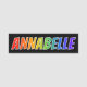 This fun, vibrant, multicolored name tag design features the common first name "ANNABELLE", with the letters of the name having a colourful rainbow spectrum like gradient colouring pattern, on a black coloured background. A nametag like this might be worn by a volunteer, an employee, or a staff member whose given name is Annabelle, to help identify the wearer to others. [~Z0000344]