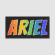 This fun, vibrant, multicolored name tag design features the common first name "ARIEL", with the letters of the name having a colourful rainbow spectrum like gradient colouring pattern, on a black coloured background. A nametag like this might be worn by a volunteer, an employee, or a customer service representative whose first name is Ariel, to help identify the wearer to customers or other people. [~Z0000344]