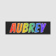 This fun, vibrant, multicolored name tag design features the common first name "AUBREY", with the letters of the name having a colourful rainbow spectrum like gradient colouring pattern, on a black coloured background. A nametag like this might be worn by a volunteer, a staff member, or a customer service representative whose given name is Aubrey, to help identify the wearer to customers or other people. [~Z0000344]
