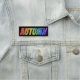This fun, vibrant, multicolored name tag design features the common first name "AUTUMN", with the letters of the name having a colourful rainbow spectrum like gradient colouring pattern, on a black coloured background. A nametag like this might be worn by a staff member, an employee, or a volunteer whose given name is Autumn, to help identify the wearer to customers or other people. [~Z0000344]