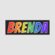 This fun, vibrant, multicolored name tag design features the common first name "BRENDA", with the letters of the name having a colourful rainbow spectrum like gradient colouring pattern, on a black coloured background. A nametag like this might be worn by a volunteer, a customer service representative, or a staff member who is named Brenda, to help identify the wearer to customers or other people. [~Z0000344]