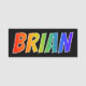 This fun, vibrant, multicolored name tag design features the common first name "BRIAN", with the letters of the name having a colourful rainbow spectrum like gradient colouring pattern, on a black coloured background. A nametag like this might be worn by a customer service representative, a volunteer, or a staff member whose given name is Brian, to help identify the wearer to others. [~Z0000344]