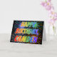 This fun, vibrant, multicolored birthday greeting card design features the message "HAPPY BIRTHDAY," and the common first name "CAMDEN" with the letters having a colourful rainbow spectrum like gradient colouring pattern. The background of the front also features a colourful pattern inspired by the appearance of bursting fireworks. The inside features a customized greeting message, or could perhaps be cleared and left blank if a message is to be written by hand instead. This might be a fun way to acknowledge the birthday of somebody named Camden. [~Z0000350]