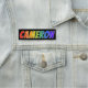 This fun, vibrant, multicolored name tag design features the common first name "CAMERON", with the letters of the name having a colourful rainbow spectrum like gradient colouring pattern, on a black coloured background. A nametag like this might be worn by an employee, a staff member, or a volunteer whose given name is Cameron, to help identify the wearer to others. [~Z0000344]