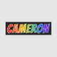 This fun, vibrant, multicolored name tag design features the common first name "CAMERON", with the letters of the name having a colourful rainbow spectrum like gradient colouring pattern, on a black coloured background. A nametag like this might be worn by an employee, a staff member, or a volunteer whose given name is Cameron, to help identify the wearer to others. [~Z0000344]