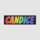 This fun, vibrant, multicolored name tag design features the common first name "CANDICE", with the letters of the name having a colourful rainbow spectrum like gradient colouring pattern, on a black coloured background. A nametag like this might be worn by a staff member, a volunteer, or a customer service representative whose name is Candice, to help identify the wearer to customers or other people. [~Z0000344]