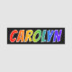 This fun, vibrant, multicolored name tag design features the common first name "CAROLYN", with the letters of the name having a colourful rainbow spectrum like gradient colouring pattern, on a black coloured background. A nametag like this might be worn by a volunteer, a customer service representative, or an employee who is named Carolyn, to help identify the wearer to others. [~Z0000344]