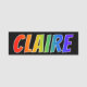 This fun, vibrant, multicolored name tag design features the common first name "CLAIRE", with the letters of the name having a colourful rainbow spectrum like gradient colouring pattern, on a black coloured background. A nametag like this might be worn by a customer service representative, an employee, or a volunteer whose first name is Claire, to help identify the wearer to others. [~Z0000344]