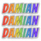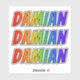 This multicolored, exciting, and fun sticker design features the common first name or given name "DAMIAN", with the letters of the name having a colourful rainbow spectrum like gradient colouring pattern. It might be a fun gift to give to somebody whose given name is Damian. [~Z0000361]