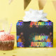 This lively and fun birthday-themed wrapping paper design has the message "HAPPY BIRTHDAY, DENISE" having a colourful rainbow spectrum inspired gradient pattern, and a vibrant bursting celebratory fireworks inspired background pattern. Fun wrapping paper like this might be used when wrapping birthday presents/gifts that are being given to somebody named Denise. [~Z0000456]