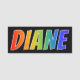 This fun, vibrant, multicolored name tag design features the common first name "DIANE", with the letters of the name having a colourful rainbow spectrum like gradient colouring pattern, on a black coloured background. A nametag like this might be worn by a customer service representative, an employee, or a staff member whose first name is Diane, to help identify the wearer to others. [~Z0000344]