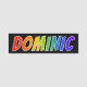 This fun, vibrant, multicolored name tag design features the common first name "DOMINIC", with the letters of the name having a colourful rainbow spectrum like gradient colouring pattern, on a black coloured background. A nametag like this might be worn by a staff member, a volunteer, or an employee whose given name is Dominic, to help identify the wearer to customers or other people. [~Z0000344]