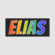 This fun, vibrant, multicolored name tag design features the common first name "ELIAS", with the letters of the name having a colourful rainbow spectrum like gradient colouring pattern, on a black coloured background. A nametag like this might be worn by a customer service representative, a staff member, or a volunteer whose given name is Elias, to help identify the wearer to customers or other people. [~Z0000344]