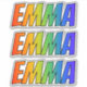 This fun, multicolored, and vibrant sticker design features the common first name or given name "EMMA", with the letters of the name having a colourful rainbow spectrum inspired gradient colouring pattern. It might be a fun gift to give to somebody named Emma. [~Z0000361]