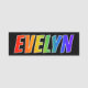 This fun, vibrant, multicolored name tag design features the common first name "EVELYN", with the letters of the name having a colourful rainbow spectrum like gradient colouring pattern, on a black coloured background. A nametag like this might be worn by an employee, a customer service representative, or a volunteer whose given name is Evelyn, to help identify the wearer to customers or other people. [~Z0000344]