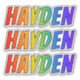 This multicolored, vibrant, and exciting sticker design features the common first name or given name "HAYDEN", with the letters of the name featuring a colourful rainbow spectrum like gradient colouring pattern. It might be a fun present to give to somebody who is named Hayden. [~Z0000361]