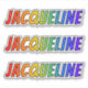 This fun, exciting, and vibrant sticker design features the common first name or given name "JACQUELINE", with the letters of the name having a colourful rainbow spectrum like gradient colouring pattern. It might be a fun present to give to somebody who is named Jacqueline. [~Z0000361]
