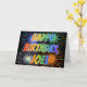 This multicolored and fun birthday greeting card design features the message "HAPPY BIRTHDAY," and the common first name "JOEL" with the letters having a colourful rainbow spectrum like gradient colouring pattern. The background of the front also features a colourful bursting fireworks inspired pattern. The inside features a custom greeting message, or could perhaps be cleared and left blank if a message is to be written by hand instead. A birthday greeting card like this might be a fun way to acknowledge the birthday of somebody named Joel. [~Z0000350]
