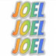 This vibrant, fun, and exciting sticker design features the common first name or given name "JOEL", with the letters of the name featuring a colourful rainbow spectrum like gradient colouring pattern. It might be a fun gift to give to somebody who is named Joel. [~Z0000361]