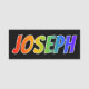This fun, vibrant, multicolored name tag design features the common first name "JOSEPH", with the letters of the name having a colourful rainbow spectrum like gradient colouring pattern, on a black coloured background. A nametag like this might be worn by a customer service representative, a volunteer, or an employee whose name is Joseph, to help identify the wearer to customers or other people. [~Z0000344]