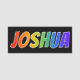 This fun, vibrant, multicolored name tag design features the common first name "JOSHUA", with the letters of the name having a colourful rainbow spectrum like gradient colouring pattern, on a black coloured background. A nametag like this might be worn by a staff member, a volunteer, or a customer service representative whose first name is Joshua, to help identify the wearer to customers or other people. [~Z0000344]