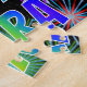 This vibrant and fun birthday-themed jigsaw puzzle design features the message "HAPPY BIRTHDAY, KYRA" having a colourful rainbow spectrum inspired gradient pattern, and a lively bursting celebratory fireworks inspired background pattern. A vibrant puzzle like this might be a fun way to send a birthday greeting message to somebody named Kyra. [~Z0000465]
