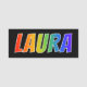 This fun, vibrant, multicolored name tag design features the common first name "LAURA", with the letters of the name having a colourful rainbow spectrum like gradient colouring pattern, on a black coloured background. A nametag like this might be worn by a staff member, a volunteer, or a customer service representative whose given name is Laura, to help identify the wearer to customers or other people. [~Z0000344]