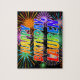 This exciting, lively, birthday-themed jigsaw puzzle design has the message "HAPPY BIRTHDAY, LAUREN" having a colourful rainbow spectrum inspired gradient pattern, and a fun bursting celebratory fireworks inspired background pattern. A colourful puzzle like this might be a fun way to send a birthday greeting message to somebody named Lauren. [~Z0000465]