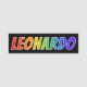 This fun, vibrant, multicolored name tag design features the common first name "LEONARDO", with the letters of the name having a colourful rainbow spectrum like gradient colouring pattern, on a black coloured background. A nametag like this might be worn by a staff member, an employee, or a volunteer whose given name is Leonardo, to help identify the wearer to customers or other people. [~Z0000344]