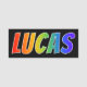 This fun, vibrant, multicolored name tag design features the common first name "LUCAS", with the letters of the name having a colourful rainbow spectrum like gradient colouring pattern, on a black coloured background. A nametag like this might be worn by a customer service representative, a staff member, or a volunteer who is named Lucas, to help identify the wearer to others. [~Z0000344]