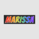 This fun, vibrant, multicolored name tag design features the common first name "MARISSA", with the letters of the name having a colourful rainbow spectrum like gradient colouring pattern, on a black coloured background. A nametag like this might be worn by a customer service representative, a volunteer, or an employee whose first name is Marissa, to help identify the wearer to others. [~Z0000344]