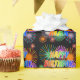 This lively and vibrant birthday-themed wrapping paper design has the message "HAPPY BIRTHDAY, MAX" having a colourful rainbow spectrum inspired gradient pattern, and an exciting bursting celebratory fireworks inspired background pattern. Vibrant wrapping paper like this might be used when wrapping presents or gifts being given in celebration of the birthday of somebody named Max. [~Z0000456]