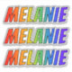 This vibrant, exciting, and fun sticker design features the common first name or given name "MELANIE", with the letters of the name featuring a colourful rainbow spectrum inspired gradient colouring pattern. It might be a fun present to give to somebody whose given name is Melanie. [~Z0000361]