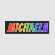 This fun, vibrant, multicolored name tag design features the common first name "MICHAELA", with the letters of the name having a colourful rainbow spectrum like gradient colouring pattern, on a black coloured background. A nametag like this might be worn by a staff member, a volunteer, or a customer service representative whose first name is Michaela, to help identify the wearer to others. [~Z0000344]