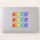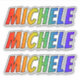 This fun, exciting, and multicolored sticker design features the common first name or given name "MICHELE", with the letters of the name having a colourful rainbow spectrum inspired gradient colouring pattern. It might be a fun present to give to somebody whose given name is Michele. [~Z0000361]