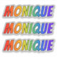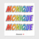This fun, multicolored, and exciting sticker design features the common first name or given name "MONIQUE", with the letters of the name having a colourful rainbow spectrum inspired gradient colouring pattern. It might be a fun present to give to somebody named Monique. [~Z0000361]