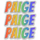 This exciting, vibrant, and fun sticker design features the common first name or given name "PAIGE", with the letters of the name featuring a colourful rainbow spectrum inspired gradient colouring pattern. It might be a fun gift to give to somebody who is named Paige. [~Z0000361]