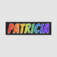 This fun, vibrant, multicolored name tag design features the common first name "PATRICIA", with the letters of the name having a colourful rainbow spectrum like gradient colouring pattern, on a black coloured background. A nametag like this might be worn by an employee, a volunteer, or a customer service representative whose name is Patricia, to help identify the wearer to customers or other people. [~Z0000344]