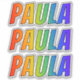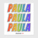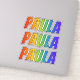 This exciting, multicolored, and fun sticker design features the common first name or given name "PAULA", with the letters of the name having a colourful rainbow spectrum inspired gradient colouring pattern. It might be a fun gift to give to somebody whose given name is Paula. [~Z0000361]