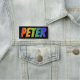 This fun, vibrant, multicolored name tag design features the common first name "PETER", with the letters of the name having a colourful rainbow spectrum like gradient colouring pattern, on a black coloured background. A nametag like this might be worn by an employee, a volunteer, or a staff member whose given name is Peter, to help identify the wearer to customers or other people. [~Z0000344]