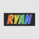 This fun, vibrant, multicolored name tag design features the common first name "RYAN", with the letters of the name having a colourful rainbow spectrum like gradient colouring pattern, on a black coloured background. A nametag like this might be worn by an employee, a customer service representative, or a volunteer who is named Ryan, to help identify the wearer to customers or other people. [~Z0000344]