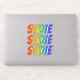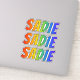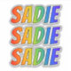 This vibrant, multicolored, and exciting sticker design features the common first name or given name "SADIE", with the letters of the name featuring a colourful rainbow spectrum like gradient colouring pattern. It might be a fun present to give to somebody who is named Sadie. [~Z0000361]