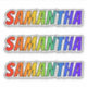 This vibrant, exciting, and fun sticker design features the common first name or given name "SAMANTHA", with the letters of the name having a colourful rainbow spectrum like gradient colouring pattern. It might be a fun gift to give to somebody whose given name is Samantha. [~Z0000361]