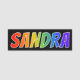 This fun, vibrant, multicolored name tag design features the common first name "SANDRA", with the letters of the name having a colourful rainbow spectrum like gradient colouring pattern, on a black coloured background. A nametag like this might be worn by a customer service representative, an employee, or a volunteer who is named Sandra, to help identify the wearer to customers or other people. [~Z0000344]