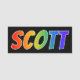 This fun, vibrant, multicolored name tag design features the common first name "SCOTT", with the letters of the name having a colourful rainbow spectrum like gradient colouring pattern, on a black coloured background. A nametag like this might be worn by a staff member, an employee, or a customer service representative whose first name is Scott, to help identify the wearer to customers or other people. [~Z0000344]