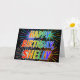 This fun, vibrant, multicolored birthday greeting card design features the message "HAPPY BIRTHDAY," and the common first name "SHELLY" with the letters having a colourful rainbow spectrum like gradient colouring pattern. The background of the front also features a colourful pattern inspired by the look of bursting celebratory fireworks. The inside features a customized greeting message, or could perhaps be cleared and left blank if a message is to be written by hand instead. A greeting card like this could be a fun way to celebrate the birthday of somebody named Shelly. [~Z0000350]