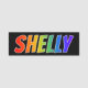 This fun, vibrant, multicolored name tag design features the common first name "SHELLY", with the letters of the name having a colourful rainbow spectrum like gradient colouring pattern, on a black coloured background. A nametag like this might be worn by a staff member, an employee, or a volunteer named Shelly, to help identify the wearer to customers or other people. [~Z0000344]