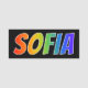 This fun, vibrant, multicolored name tag design features the common first name "SOFIA", with the letters of the name having a colourful rainbow spectrum like gradient colouring pattern, on a black coloured background. A nametag like this might be worn by a staff member, a volunteer, or an employee named Sofia, to help identify the wearer to others. [~Z0000344]
