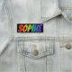 This fun, vibrant, multicolored name tag design features the common first name "SOPHIE", with the letters of the name having a colourful rainbow spectrum like gradient colouring pattern, on a black coloured background. A nametag like this might be worn by a staff member, a volunteer, or an employee whose given name is Sophie, to help identify the wearer to others. [~Z0000344]